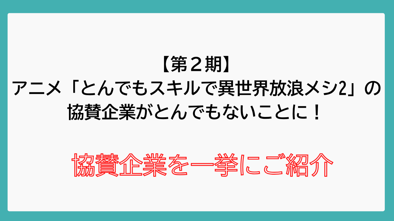 この記事では、TVアニメ「とんでもスキルで異世界放浪メシ2」の協賛企業をまとめてみました。
